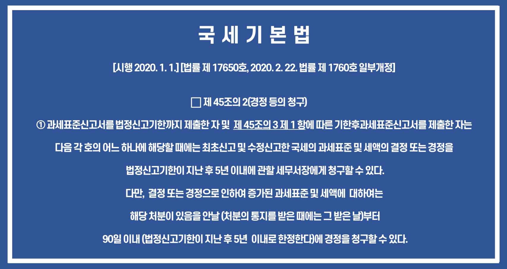 경정청구는 국세기본법 제45조의2 제1항에 의거하여 직전 5년 동안 공제받지 못했던 세제혜택으로 인해 더 납부한 법인세(법인사업자)나 종합소득세(개인사업자)를 국세청으로부터 환급받을 수 있는 제도입니다.