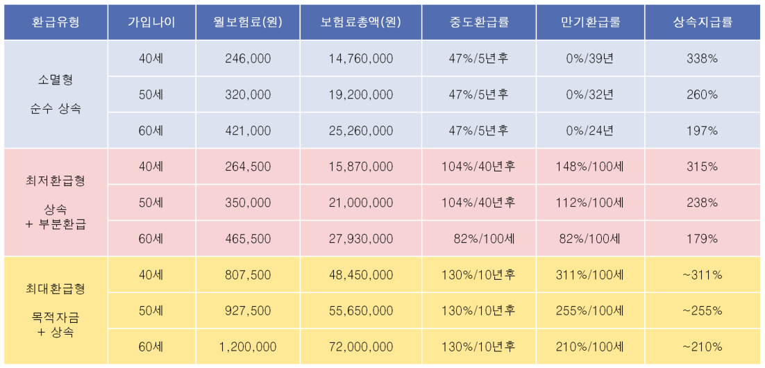 최대환급형 : 목돈마련을 위한 상품으로 10년 후부터 130% 이상을 비과세로 불릴 수 있습니다. 오래 장수하신다면 소멸형에 육박하는 배수로 상속하실 수도 있습니다.
